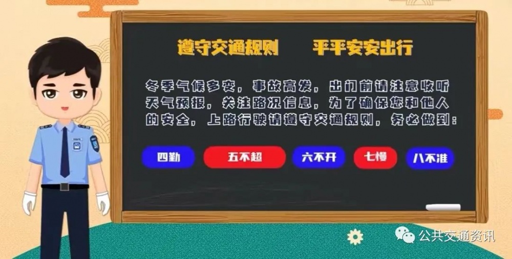 冬季氣候多變,事故高發(fā),出門(mén)前請(qǐng)注意收聽(tīng)天氣預(yù)報(bào),關(guān)注路況信息,為了確保您和他人的安全, 上路行駛請(qǐng)遵守交通規(guī)則,務(wù)必做到:四勤、五不超、六不開(kāi)、七慢、八不準(zhǔn) 。