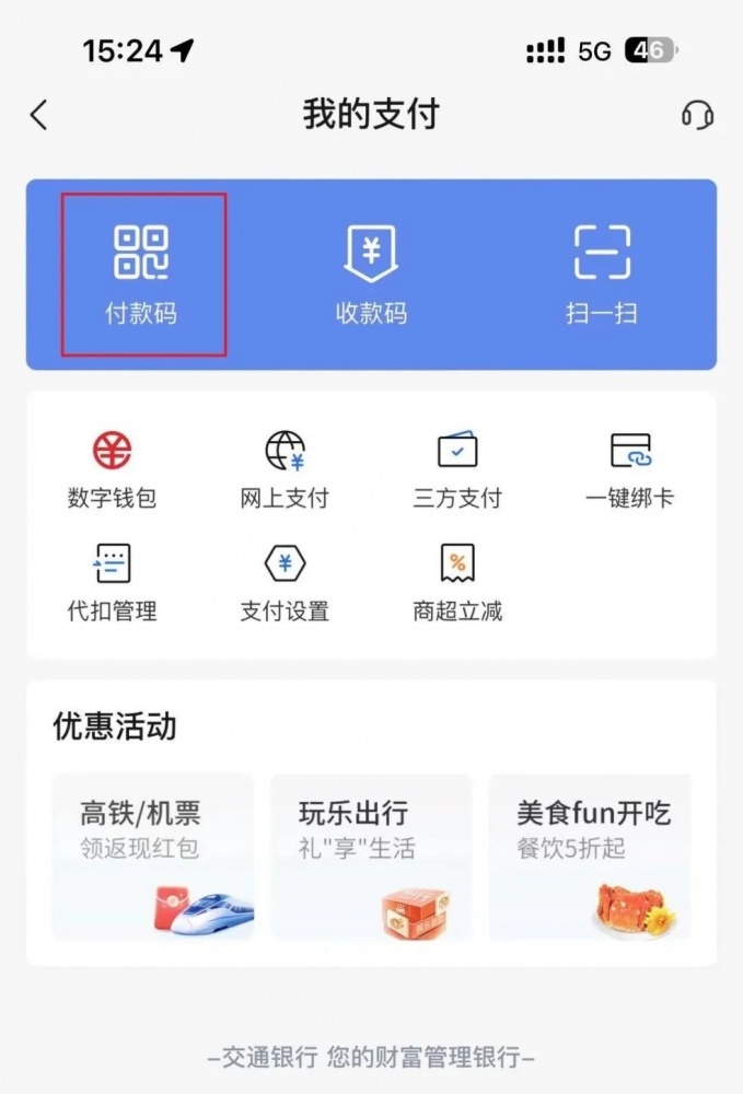第一步:登錄交通銀行手機(jī)銀行APP-首頁(yè)-我的支付-付款碼
