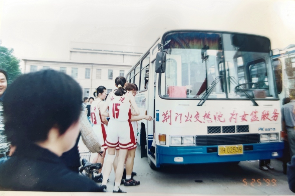 ▲1999年5月25日,沈陽(yáng)電梯隊(duì)隊(duì)員、教練乘坐公交出行。公交車頭還掛有“荊門公交熱忱為女籃服務(wù)”橫幅。