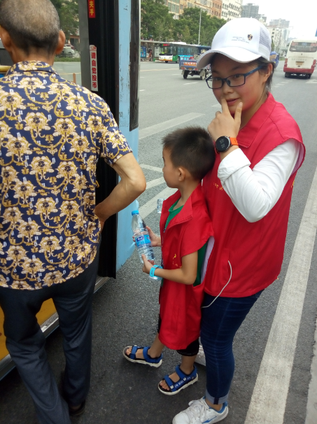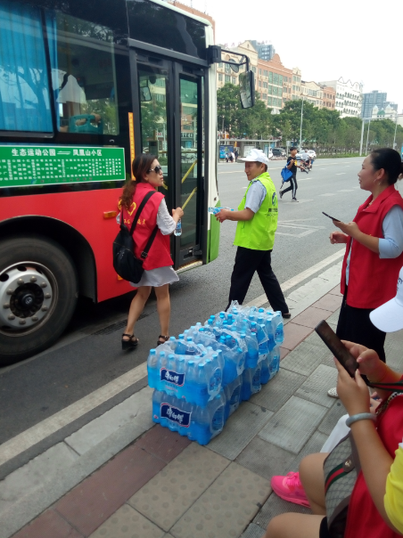 15時許,志愿者們已經(jīng)布置好了送水點(diǎn),將箱礦泉水?dāng)[在了站臺旁邊。每有一輛公交車進(jìn)站???,志愿者們都會給駕駛員們遞上兩瓶礦泉水,還有一些放暑假的小朋友們,也熱情的加入到此次活動,充當(dāng)著志愿主力軍,用他們的行動清涼了公交駕駛員的心,傳播著社會正能量。