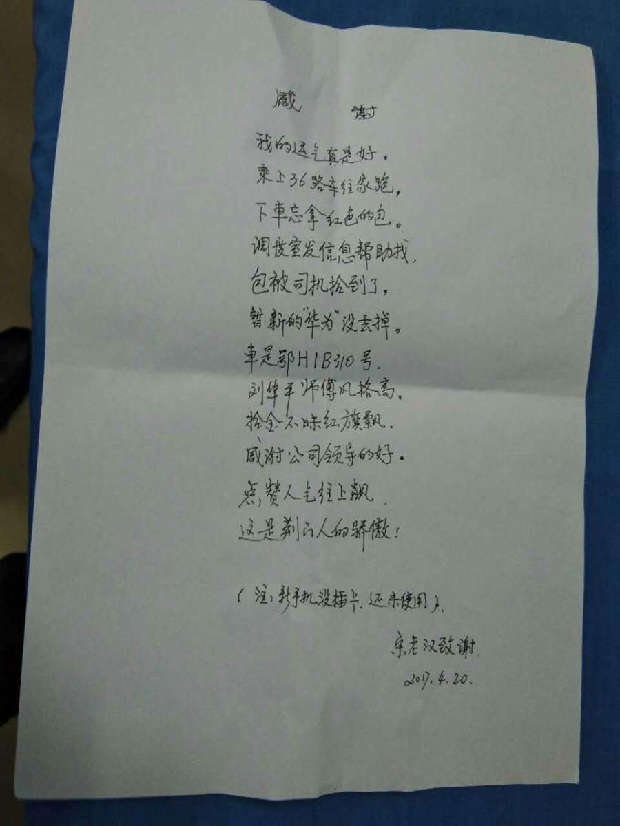 4月20日,宋成美老人從公交公司領(lǐng)回了昨日忘在公交車上的包包等物品,笑得合不攏嘴,并欣欣然作詩: