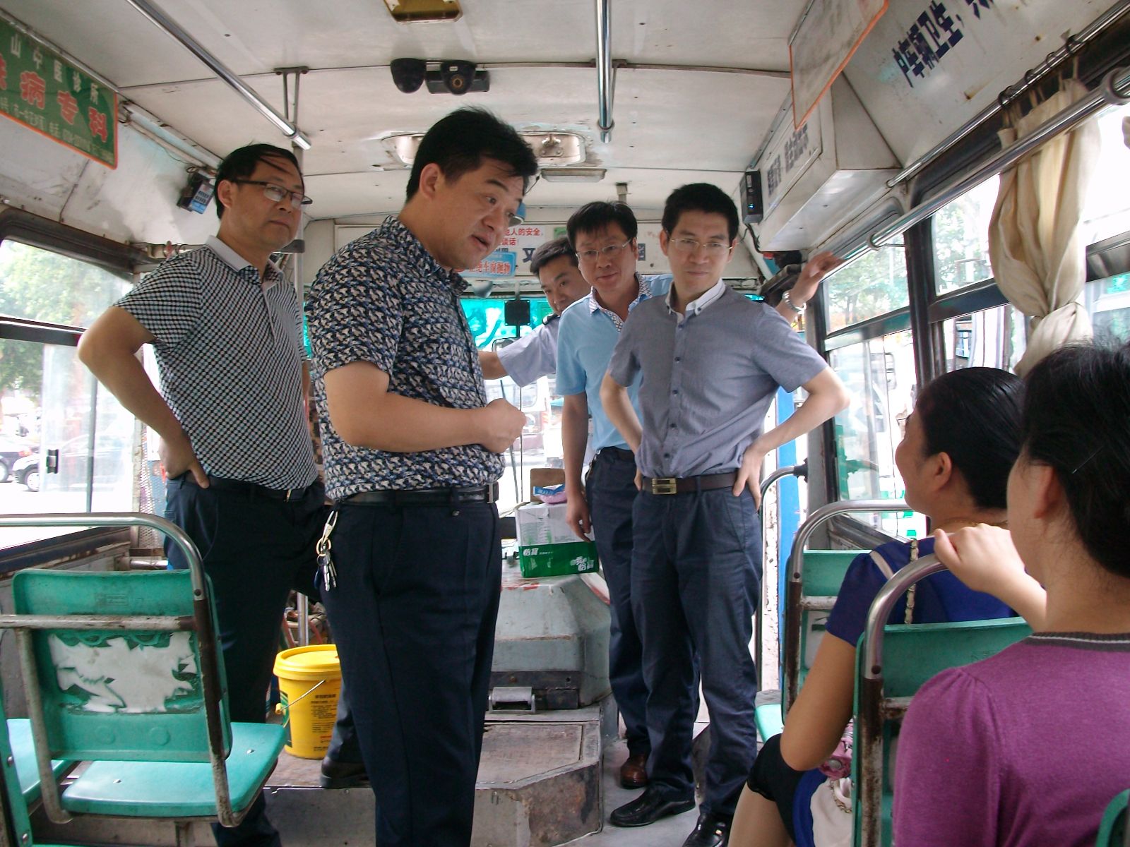 伍應(yīng)彪(左二)征求市民對(duì)改善乘車環(huán)境的意見和建議